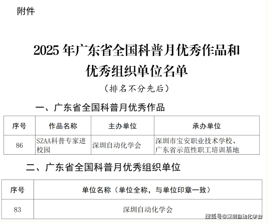 捷报传来,喜信盈门!近日,广东省科学手艺协会正式印发《关于发布2025年广东省全国科普月优良做品和优良组织单元的通知》(粤科协〔2026〕1号),深圳从动化学会凭仗结实的科普实践取高效的组织统筹能力,斩获双项殊荣——从办的“SZAA科普专家进校园”勾当获评“2025年广东省全国科普月优良科普勾当案例”,学会获评“2025年广东省全国科普月优良组织单元”,以硬核实绩彰显了学会正在科普赋能财产、办事教育中的标杆感化!